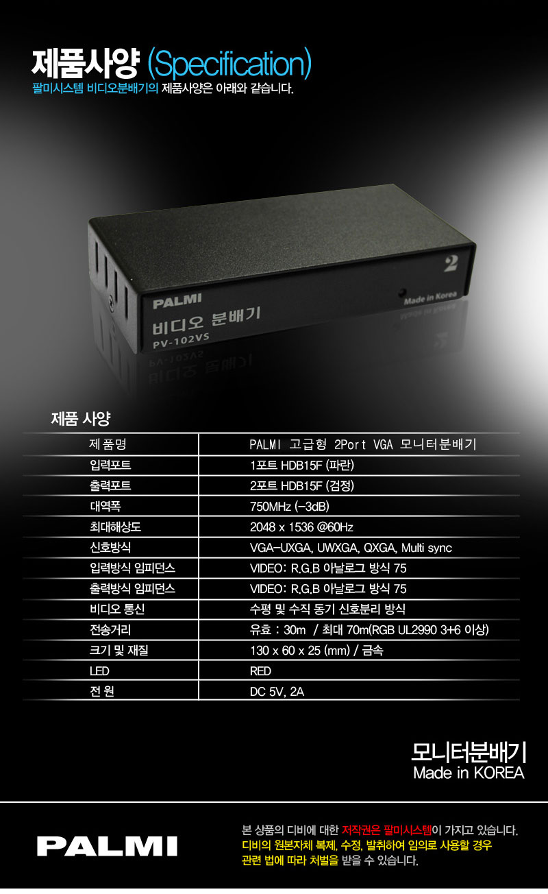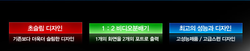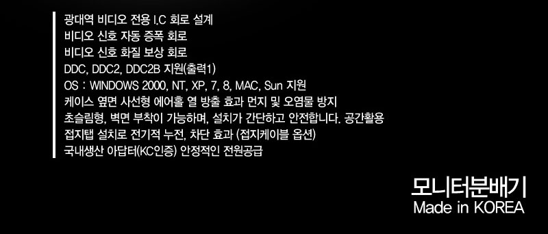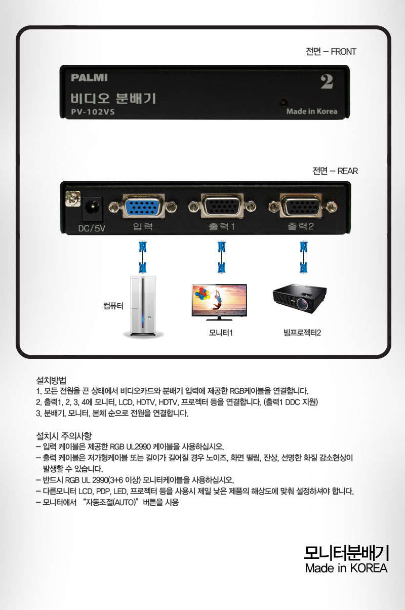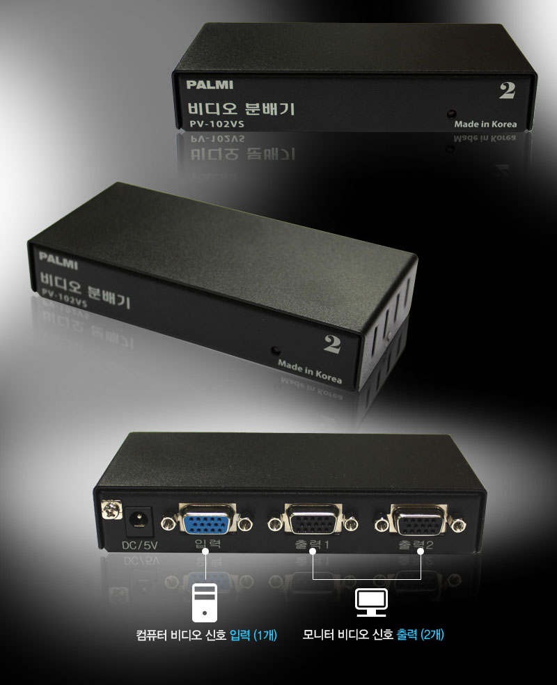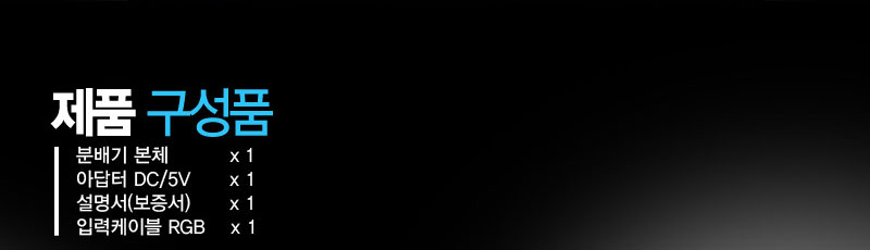 º»Á¦Ç°Àº 1°³ÀÇ RGB ºñµð¿À ÀÔ·Â ½ÅÈ£¸¦ 2´ëÀÇ ¸ð´ÏÅÍ, TV, ÇÁ·ÎÁ§ÅÍ µî¿¡ ¿¬°áÇÏ¿© °°Àº ȸéÀ» µ¿½Ã Ãâ·ÂÇÏ´Â Á¦Ç°ÀÔ´Ï´Ù.